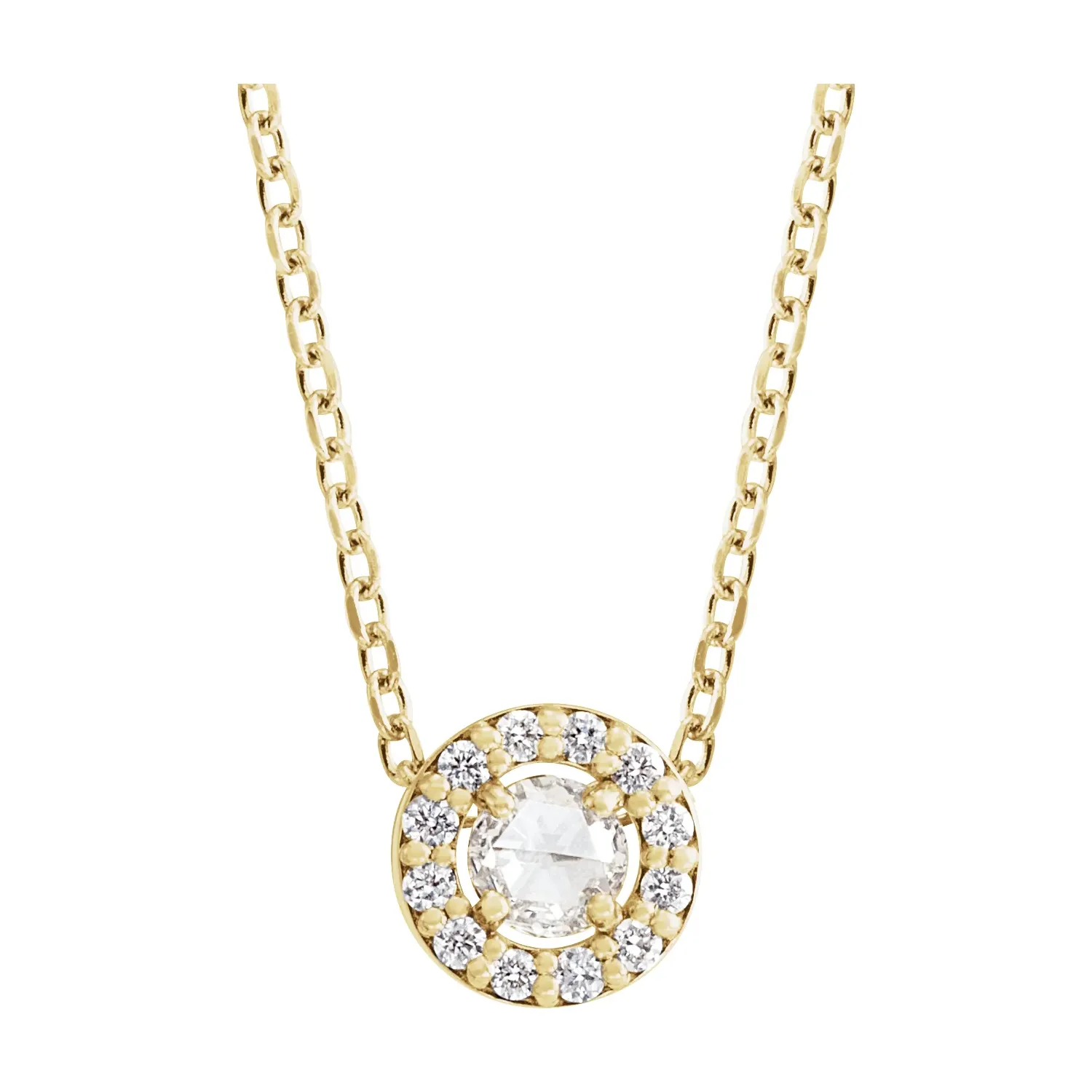 Necklace / Set / 14K Yellow / Round / Natural Diamond / 3Mm :: 1/8 Ctw / Vs/Si1, I1, Ghi, G-H / 16-18 In / Polished / 1/8 Ctw Natural Rose-Cut Natural Diamond Halo-Style Necklace