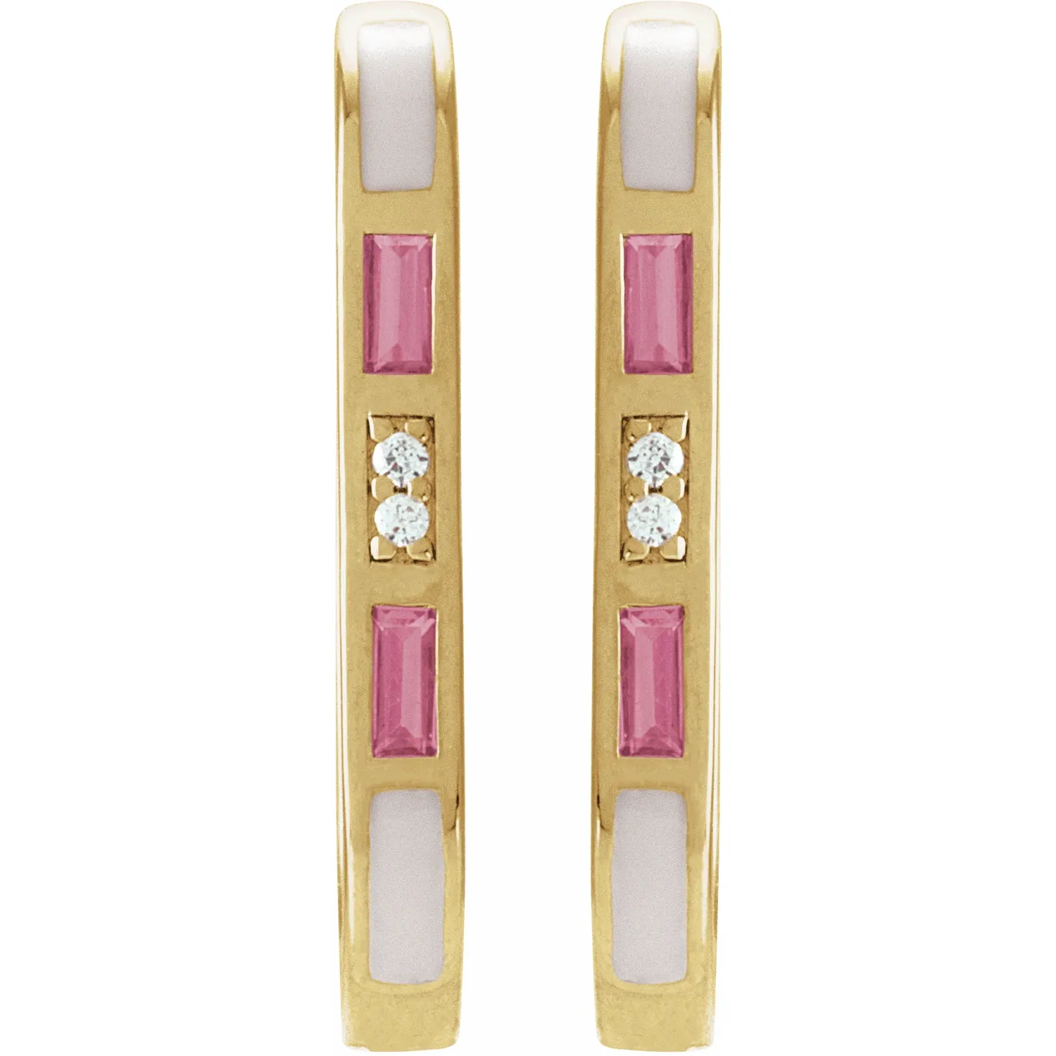 689131 / Earring / Set / 14K Yellow / 19.6 X 12.5 Mm / 2.3 Mm / Natural Pink Tourmaline / Straight Baguette / 3 X 1.5Mm :: .025 Ctw / Pair / Hinged / Polished / Natural Pink Tourmaline And .02 Ctw Natural Diamond Hoop Earrings